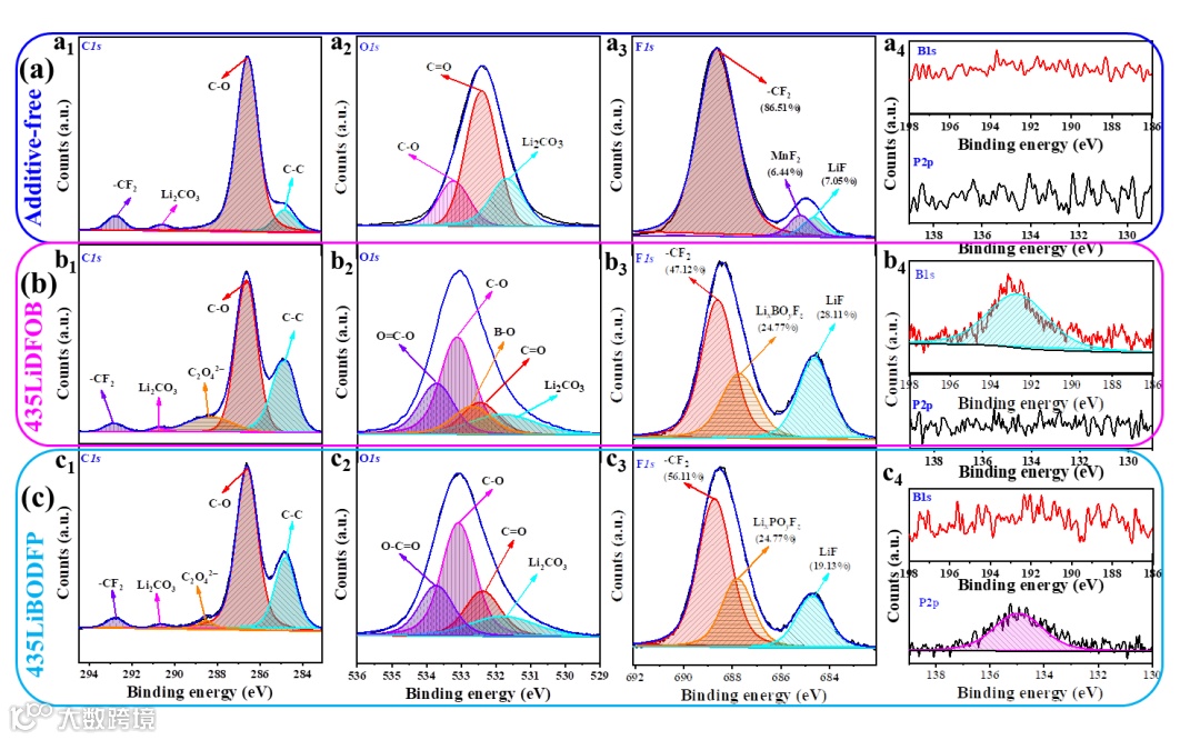 图5. 由(a)无添加剂、(b) 435LiDFOB 和 (c) 435LiBODFP复合固态电解质膜组装的电池在循环后拆解获得的正极XPS扫描结果。
