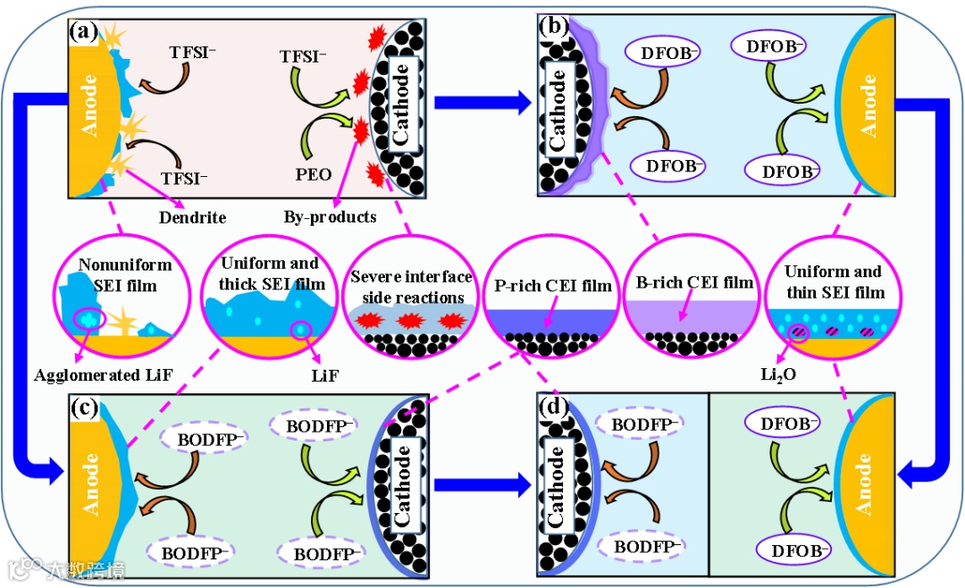 图1. 不同功能性添加剂对全固态锂金属电池中的正负极界面的影响示意图。
