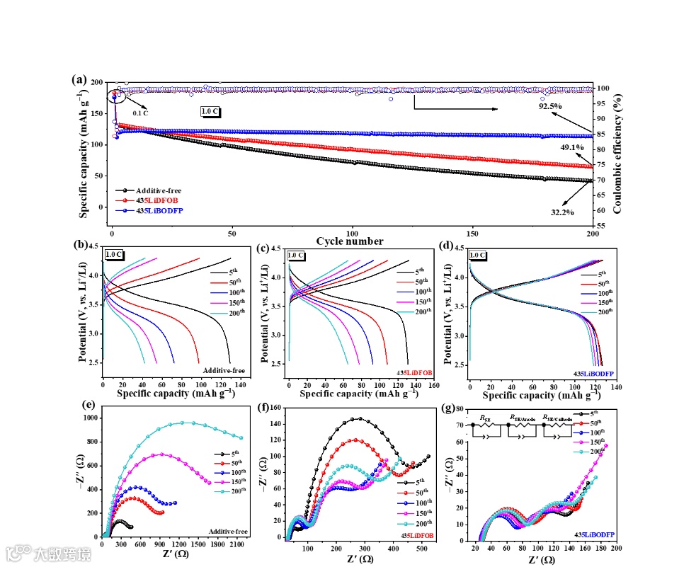 图2. (a) 不同添加剂的复合电解质膜组装的电池在1.0 C、2.5~4.3 V电压范围内的循环稳定性;所组装的电池在不同循环次数后的充放电曲线:(b)无添加剂,(c) 435LiDFOB 和 (d) 435LiBODFP 复合电解质,以及由(e)无添加剂、(f) 435LiDFOB 和 (g) 435LiBODFP 复合电解质组装的电池在不同循环次数后的EIS结果。