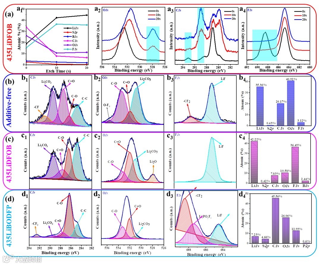 图4. (a)从多晶NCM622/435LiDFOB/Li 电池获得的循环后锂负极在不同蚀刻时间下的XPS扫描结果;由(b)无添加剂、(c)435LiDFOB 和(d) 435LiBODFP复合固态电解质膜组装的电池循环后的锂负极在蚀刻时间为10s时的XPS扫描结果。