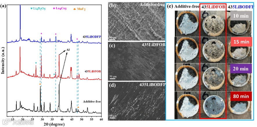 图3. (a)正极在1C下循环200圈后的XRD结果;分别由(b)无添加剂、(c) 435LiDFOB 和 (d) 435LiBODFP 复合电解质组装的电池在循环后锂负极的表面形貌;(e) 循环后锂负极暴露在空气中不同时间的照片。