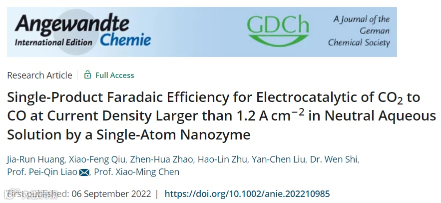 Single-Product Faradaic Efficiency for Electrocatalytic of CO2 o CO at Current Density Larger than 1.2 A cm−2 in Neutral Aqueous Solution by a Single-Atom Nanozyme