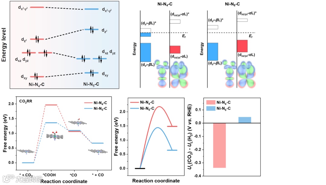 进一步地,作者通过理论计算发现轴向配位的氮原子提升了Ni金属中心dz2的轨道能级并降低了dxz/yz轨道能级,进而导致CO2活化以及CO脱附变得更加容易,促使eCO2RR在超宽电位范围内都具有高选择性和耐久性(图4)。