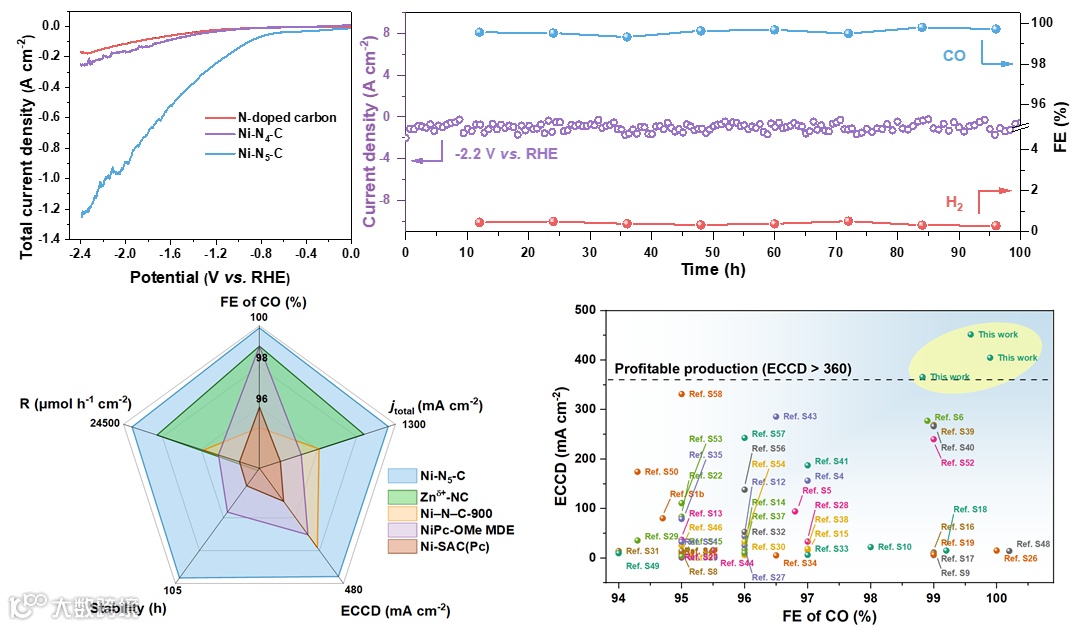 在0.5M的KHCO3水溶液中,Ni−N5−C对CO表现出超高催化活性及选择性,在-2.4 V vs. RHE的条件下电流密度为1.23 A cm-2且法拉第效率达到了99.6%。此外,Ni−N5−C在-2.2 V vs. RHE下电催化工作了100小时,其选择性和电流密度维持在同一水平。与目前报导过的绝大多数催化剂相比,Ni−N5−C的综合催化性能从多角度评估都是最优异的(图3)。