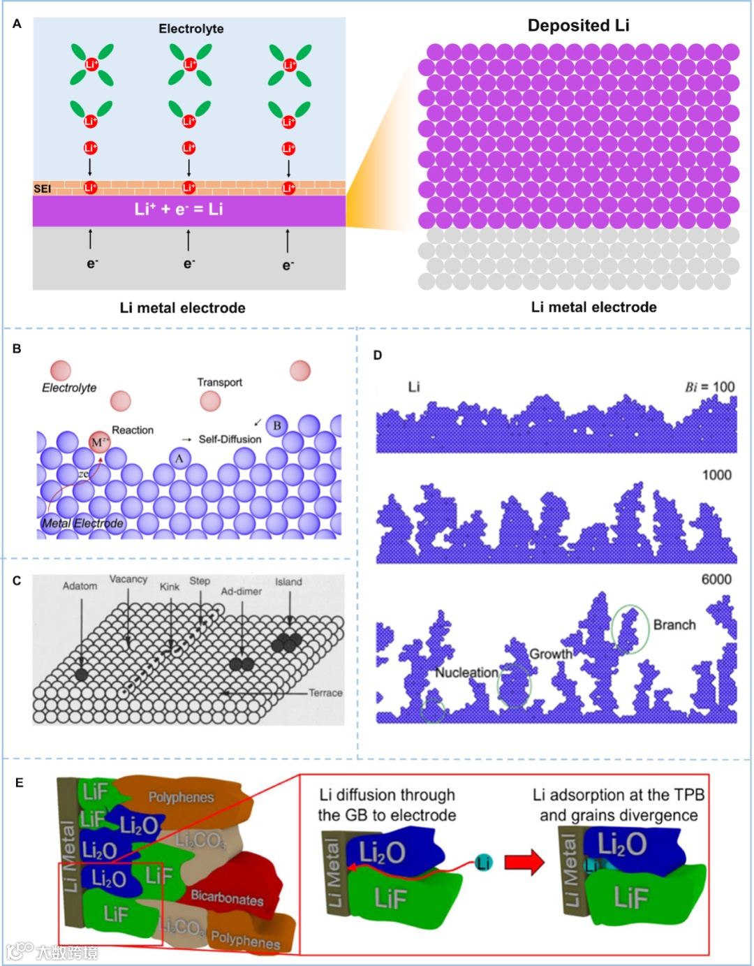 图 3. 锂金属的沉积过程。(A)SEI膜与锂金属电极之间的锂成核和生长过程示意图。(B)不同电化学Bi数的锂原子电沉积形貌。(C)简单立方晶体表面的step-kink模型示意图。(D)金属电沉积原理图。(E) 锂原子通过晶界传输到锂金属电极和在三相界面吸附的示意图。