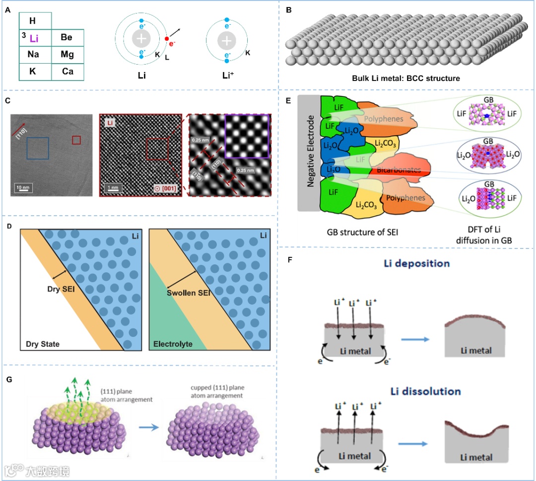 图2. 锂金属及其表面SEI膜的认识。(A)Li金属元素在元素周期表中的位置及其电子结构。(B)锂金属的晶体结构示意图。(C)锂金属在室温下的原子分辨率图像被首次证实。(D)SEI膜在干燥状态和有电解质状态下的比较。(E)Li+在晶界处传输的示意图。(F)锂在沉积/溶解过程中的体积变化。(G)锂原子沿(111)晶面剥离所诱导的杯状表面的原子模型。