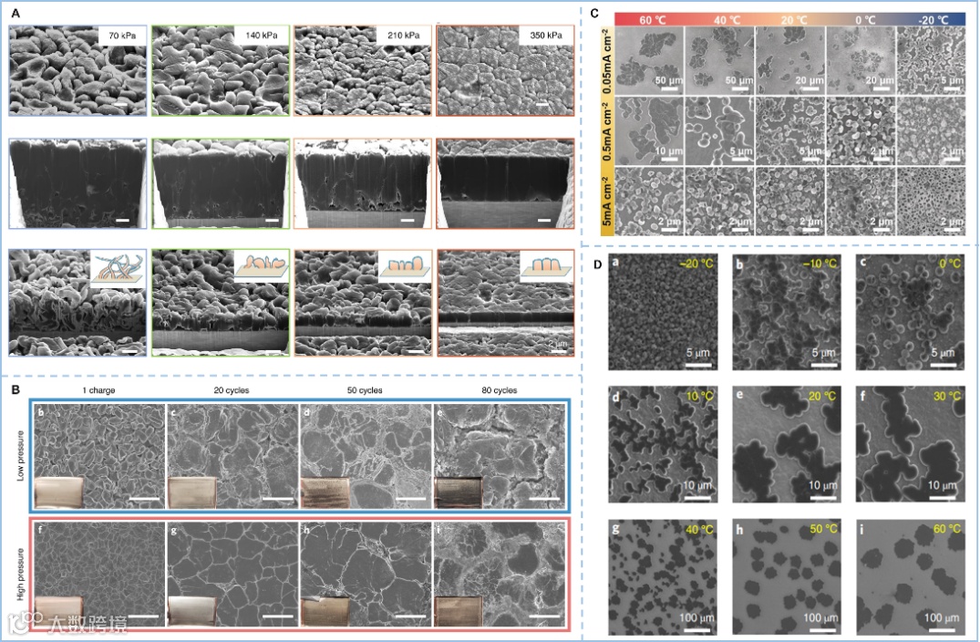 图5. 压力和温度对锂金属沉积形貌的影响。(A)不同压力下沉积的锂金属表面的形貌。比例尺:2 μm。(B)沉积形态锂金属在两种不同的机械压力下。注:蓝色线框170kpa,红色线框1170kpa。比例尺为25 μm。(C)在-20~60℃条件下,沉积的锂金属表面形貌。(D)不同温度下沉积的锂金属表面形貌。