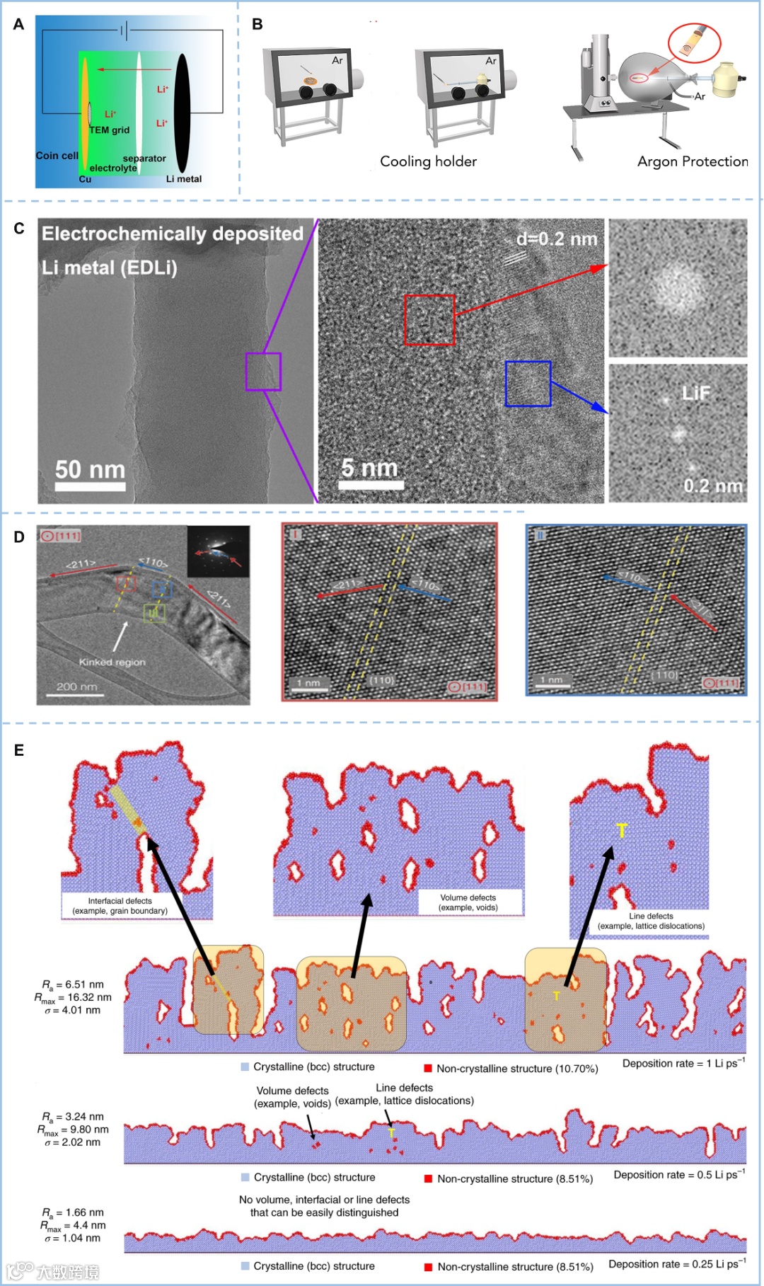 图7. 先进的表征技术和理论计算用于理解锂金属沉积。(A) 扣式电池中锂沉积的示意图。(B)冷冻电镜样品的制备工艺。(C)沉积锂的冷冻电镜图像。(D) 锂金属枝晶沿不同晶面的原子结构。(E)不同速率沉积锂的分子动力学模拟。