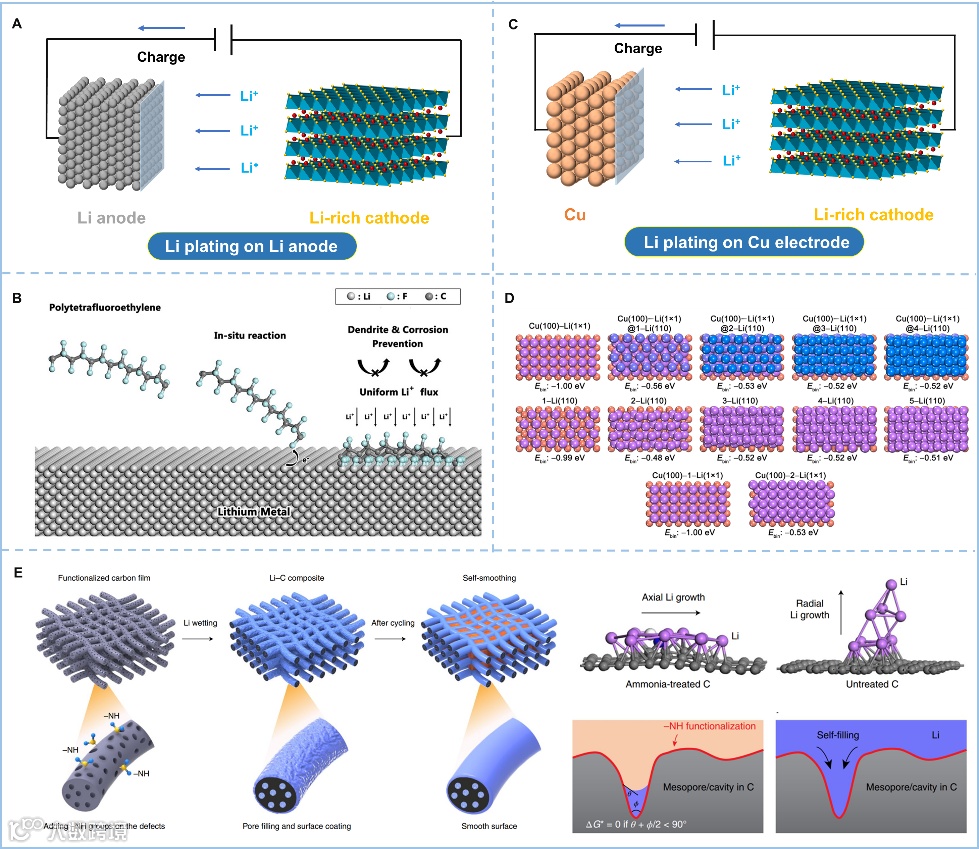 图4. 基底对锂金属沉积形貌的影响。(A)锂金属电极电极上沉积的示意图。(B)富含LiF膜的设计示意图。(C)锂在铜集流体沉积的示意图。(D)锂在单晶Cu表面沉积的示意图。(E)锂在三维基底上沉积的示意图。