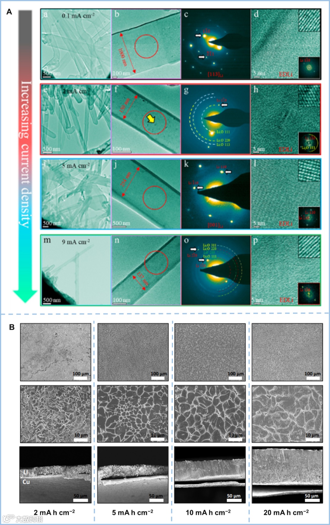 图6. 电流密度对锂金属沉积形貌的影响。(A)不同电流密度下沉积锂的微观结构。(B)高沉积容量下沉积锂的形貌。