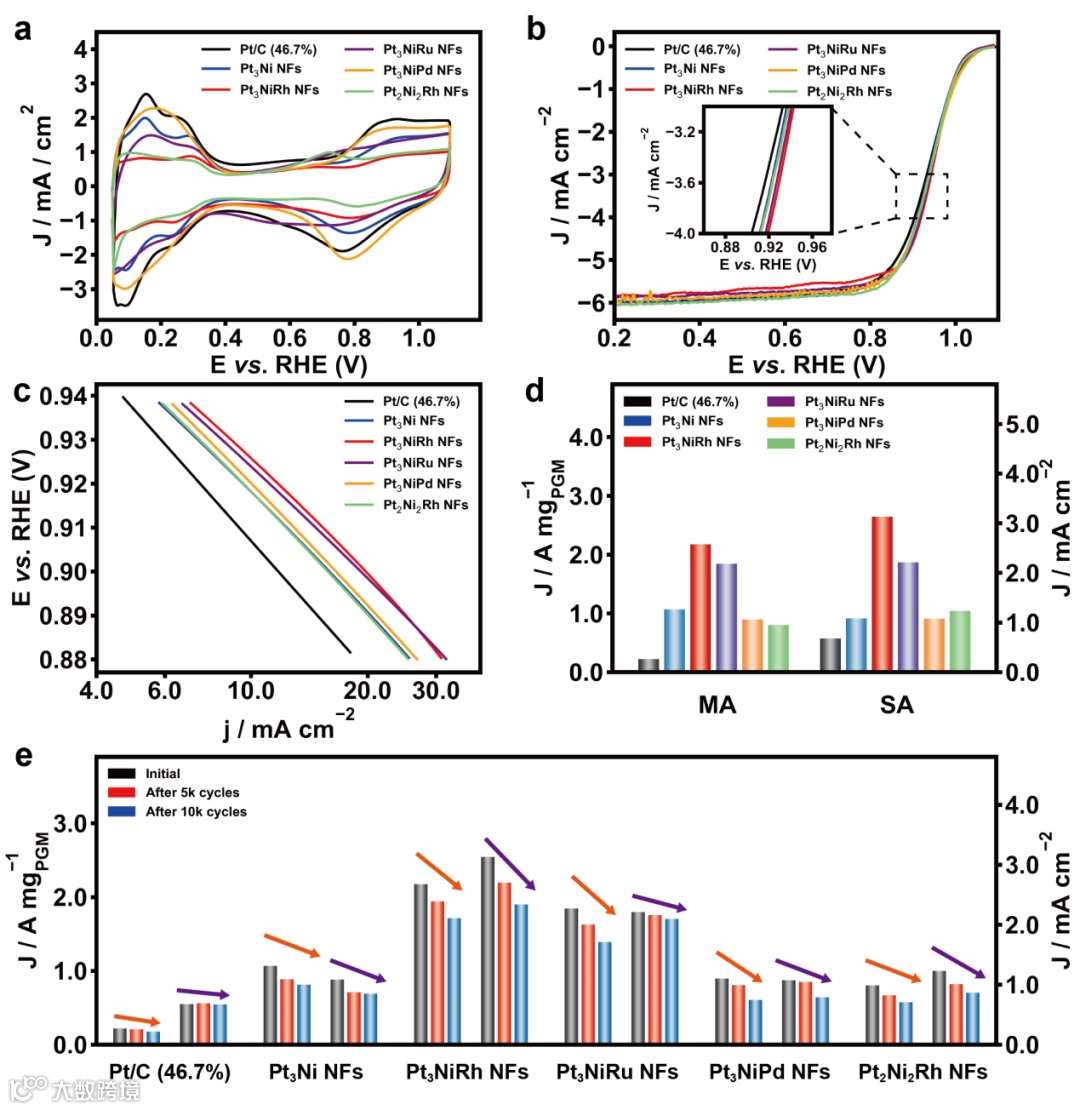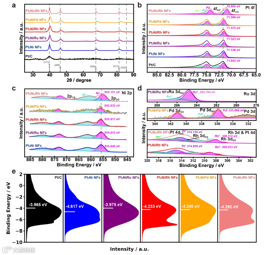 XPS分析结果表明Rh,Ru,Pd的添加引起了Pt,Ni,Rh/Ru/Pd之间的相互作用。例如,Pt3NiRh和Pt3NiPd NFs金属态的Pt 4f7/2以及Ni 2p3/2 峰相对于Pt3Ni的正向移动意味着电子从Pt,Ni到Rh,Pd的转移。而在Pt3NiRu NFs中,电子则从Ru转移到Pt和Ni。此外,催化剂中Pt0与M(Rh0,Ru0,Pd0)原子含量的百分比存在反相关关系。