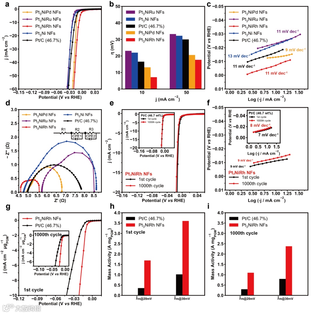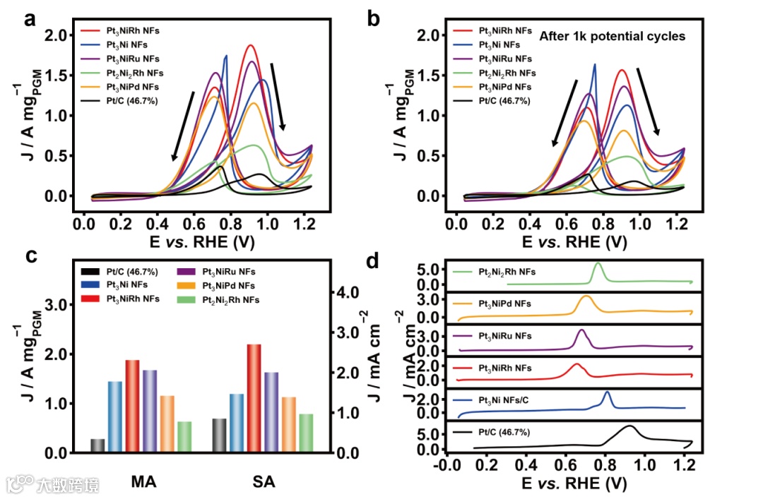 通过ORR,MOR,以及HER测试表明,Pt3NiRh NFs因其富晶枝的结构,丰富的活性位点,以及较低的d带中心,具有最好的ORR,MOR,HER性能。对于ORR,MOR及HER,Pt3NiRh NFs的质量活性分别是商业Pt/C的9.9,6.8及4.8倍。另外,在ORR以及MOR反应中,Pt3NiRh NFs显示出了最好的抗毒化能力。