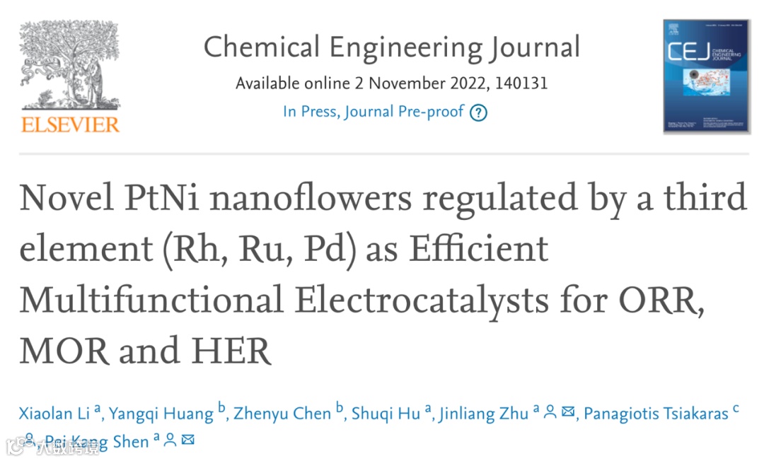 来自广西大学的沈培康教授团队,在国际知名期刊Chemical Engineering Journal上发表题为“Novel PtNi nanoflowers regulated by a third element (Rh, Ru, Pd) as Efficient Multifunctional Electrocatalysts for ORR, MOR and HER”的文章。该文章通过水热退火法制备了三金属Pt-Ni-M(M=Rh,Ru,Pd)纳米花,详细讨论了Rh,Ru,Pd的添加对Pt-Ni基催化剂形貌,电子结构,催化性能(ORR,MOR,HER)等的影响。