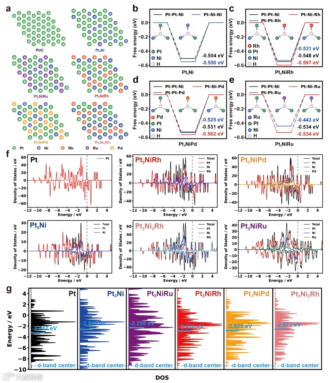 图 5. 催化剂的氢吸附自由能,态密度及d带中心计算结果。