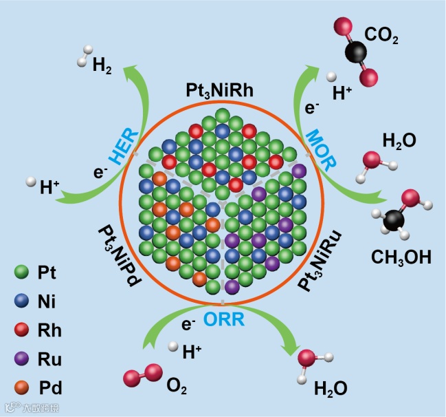 图 1. 催化剂表面ORR,MOR,HER反应示意图。