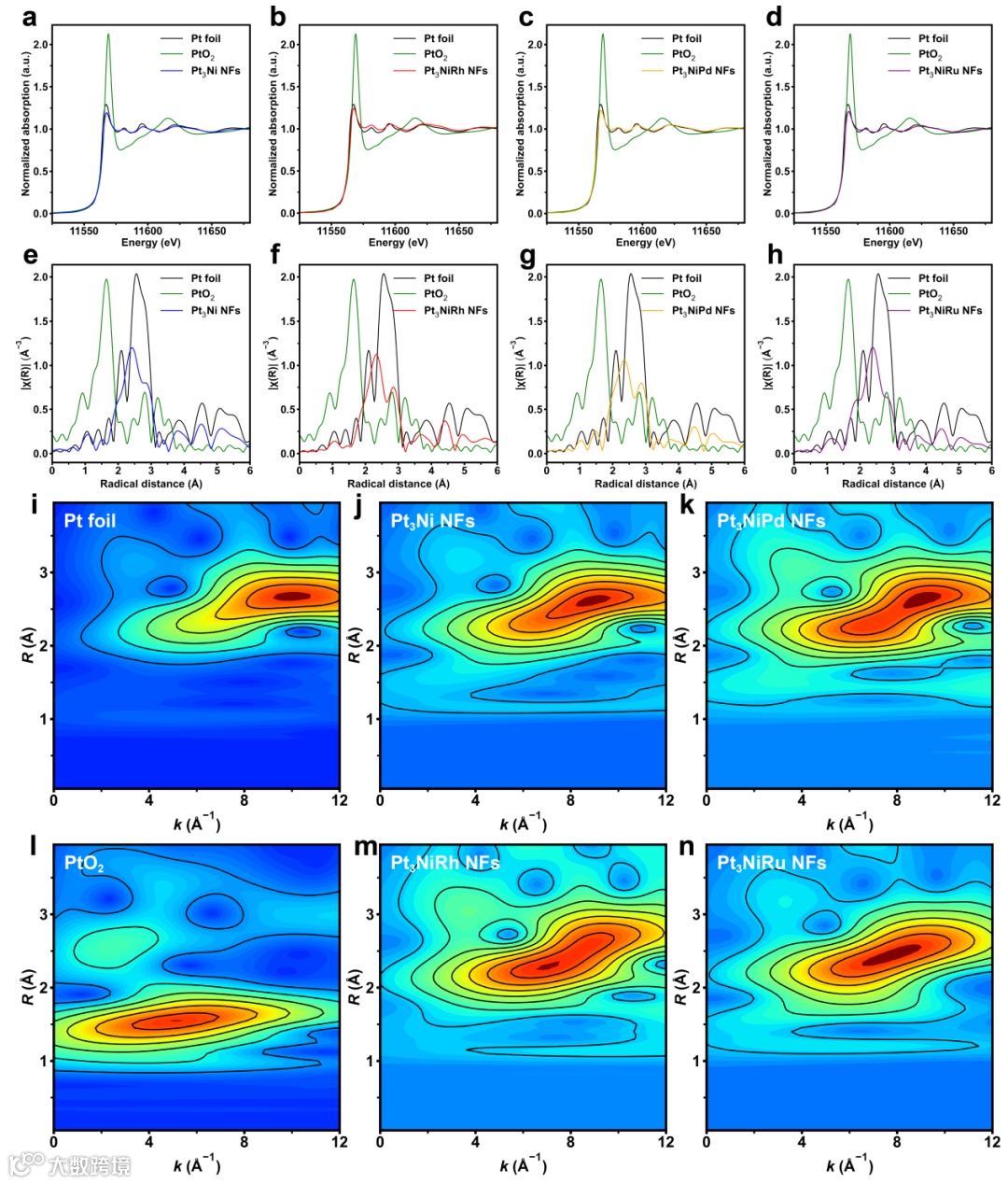 UPS结果表明,Pt3NiRh和Pt3NiPd NFs的d带中心低于Pt3NiRu NFs,这与XPS测试结果一致,意味着Pt与中间产物的结合能减弱,提高了催化剂的性能。XANES及EXAFS分析反映了催化剂的化学信息,进一步证实了元素掺杂对样品电子结构的影响。