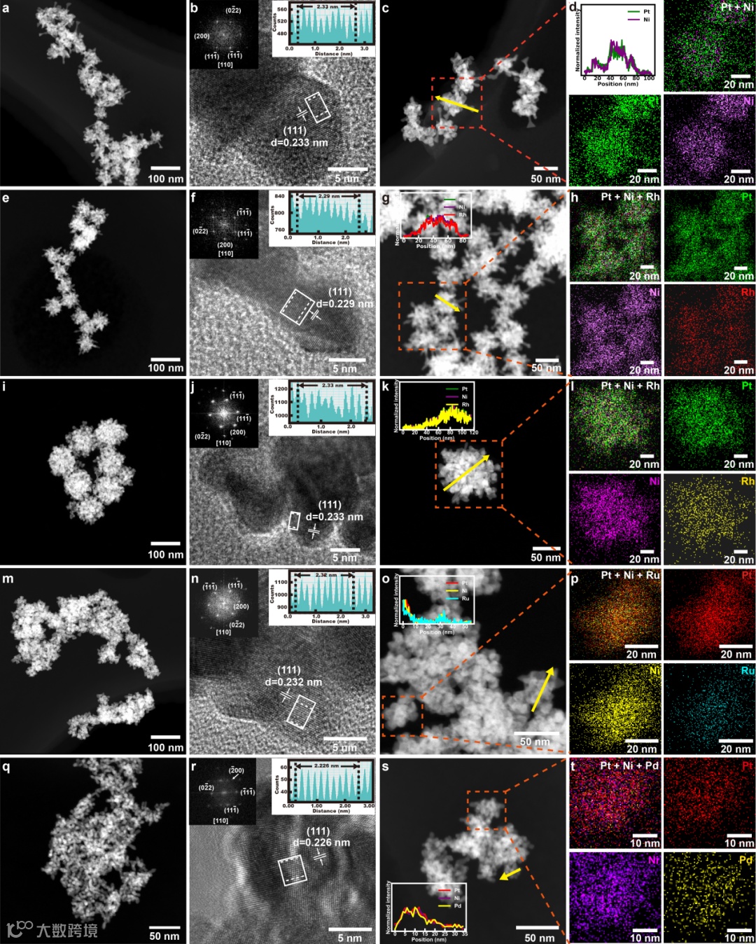 图 2. Pt3Ni(a-d)、Pt3NiRh(e-h)、Pt2Ni2Rh(i-l)、Pt3NiRu(m-p)和Pt3NiPd(q-t)纳米花的形态和结构特征。