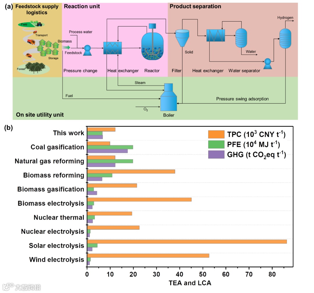 图4生物质制氢的技术经济分析和全生命周期评估。(a)生物质制备氢气的过程模型;(b)该过程与先前报道过程的比较。