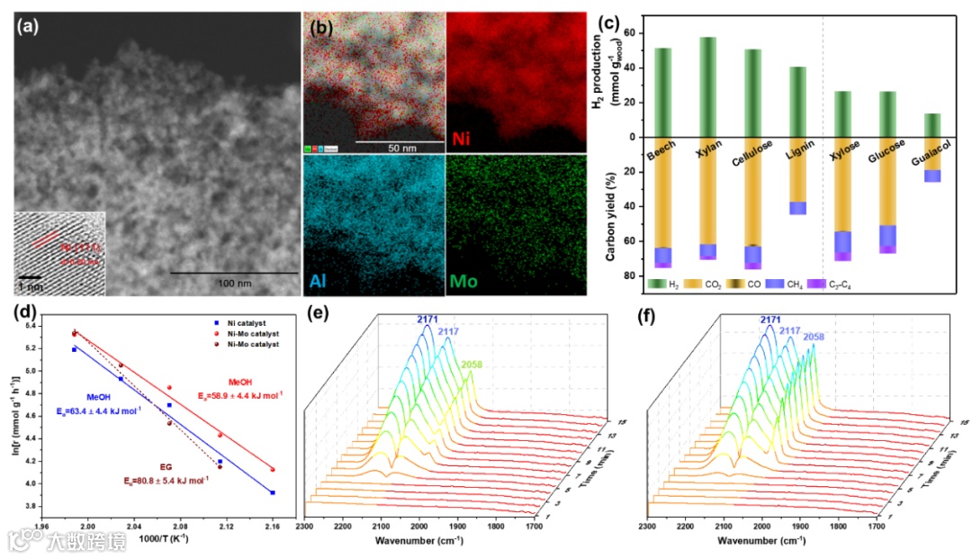 图2 Ni-Mo催化剂的表征和提出的反应路径。(a)Ni-Mo催化剂的HRTEM图;(b)Ni-Mo催化剂中Ni、Al、Mo的EDS元素分布图;(c)木质纤维素结构单元的转化;(d)甲醇和乙二醇模型分子的反应动力学;(e)Ni和(f)Ni-Mo催化剂CO吸附的DRIFT谱图。