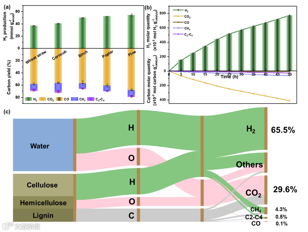图3催化多种农林废弃物转化制备氢气。(a)多种农林废弃物转化的氢气产量和气体碳产率;(b)Ni-Mo催化剂的循环使用性;(c)生物质转化制备氢气的Sankey图。