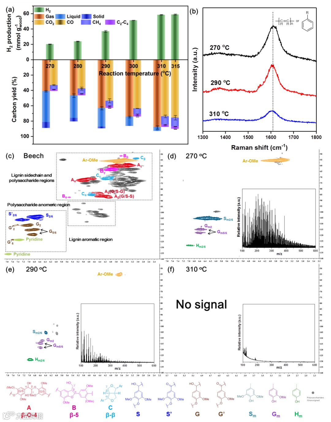 图1 Ni-Mo催化榉木转化制备氢气。(a)氢气产量,气体、液体和固体产物的碳产率以及气体产物的分布情况;(b)固体产物的紫外拉曼谱;(c)榉木木屑的二维核磁图;(d-f)不同反应温度下液体产物的二维核磁和飞行时间质谱分析。