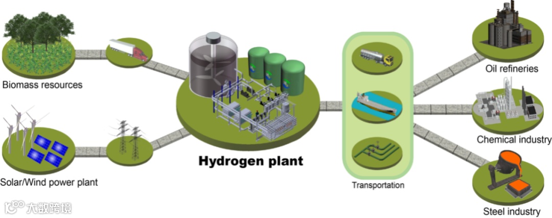 利用该技术路线,有望实现从原生生物质出发,利用光电/风电等制备生物质氢气,再通过储存和运输将氢气用于石油、化学和钢铁等工业中。