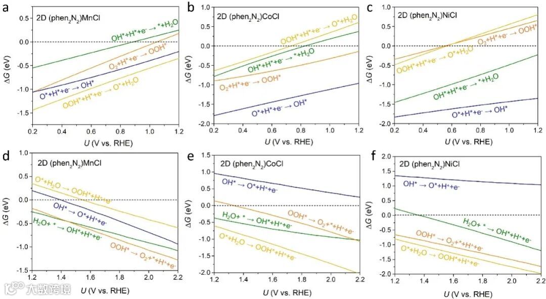 图4. (a,d)2D (phen2N2)MnCl,(b,e) (phen2N2)MnCl和(c,f) (phen2N2)MnCl 的ORR和OER活性。