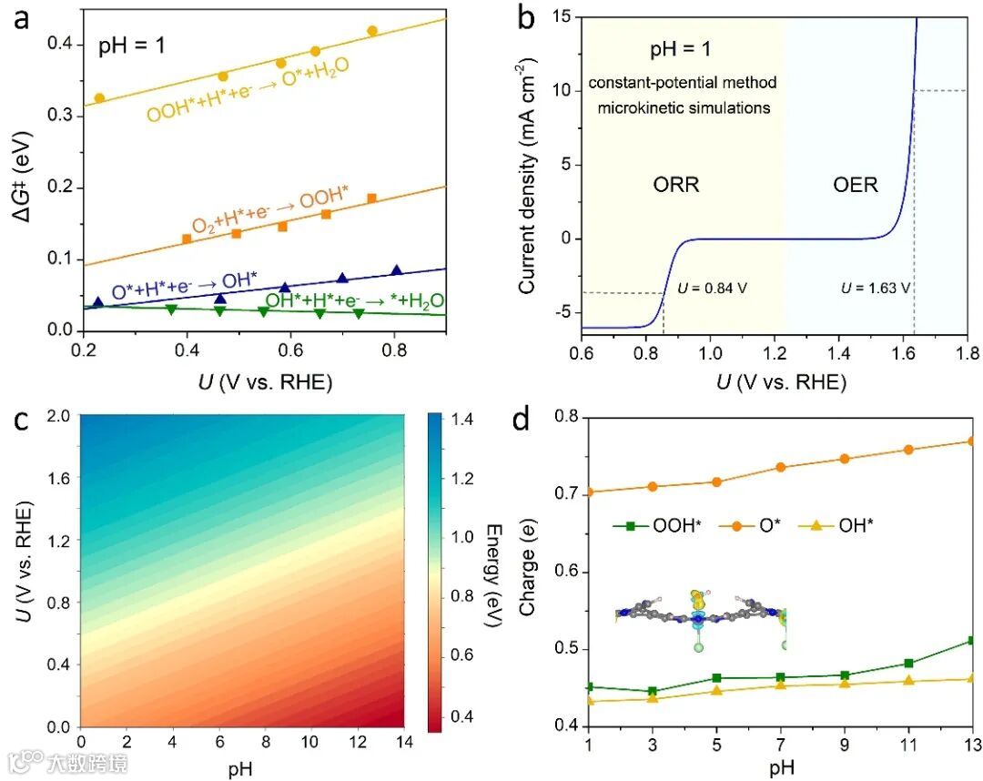 计算结果显示,当pH=1时,材料ORR的半波电势高达0.84 V, 同时OER反应的起始电位也仅为1.63 V。证明了该材料在酸性条件下具有很高的ORR和OER双功能活性。由于pH影响中间体的吸电子效应,从而导致中间体吸附强度发生变化,进一步影响反应活性。