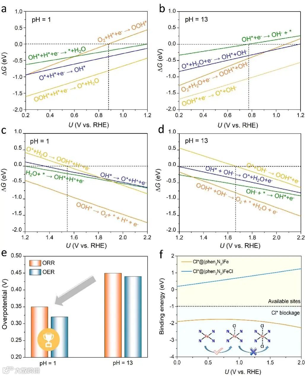 图2. (a, b) 2D (phen2N2)FeCl材料在pH=1和pH=13时的ORR活性;(c, d)2D (phen2N2)FeCl材料在pH=1和pH=13时的OER活性; (e)ORR和OER在pH=1和pH=13的过电势;(f) pH=1时,Cl*结合能。