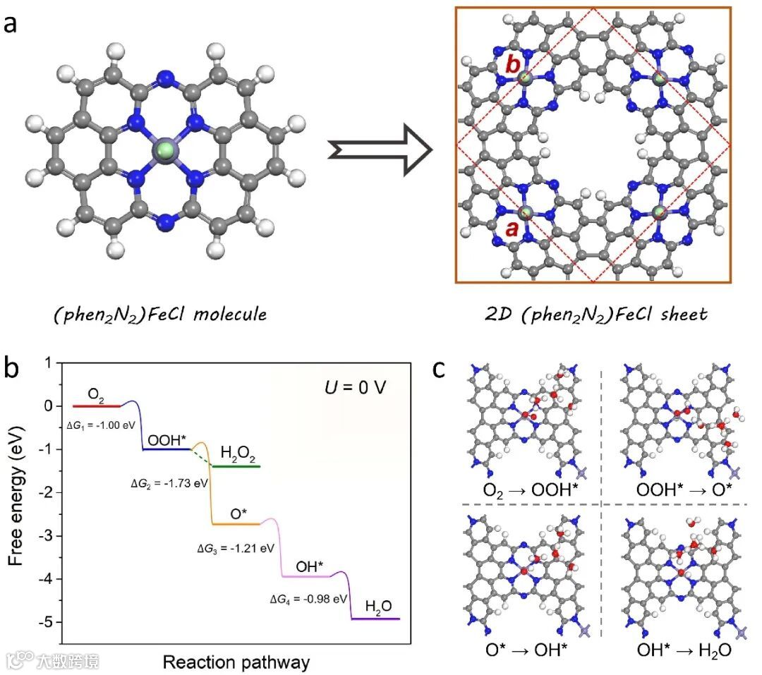 图1. (a) (phen2N2)FeCl分子和(phen2N2)FeCl单层结构(b)CHE方法计算ORR自由能(c)ORR质子转移过程的过渡态。