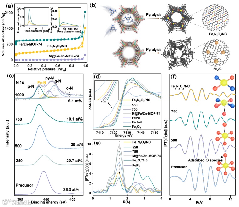图2. 通过N2吸附-脱附等温线,XPS、Fe K 边同步辐射等对Fe1N2O2/NC催化剂的形成过程分析。