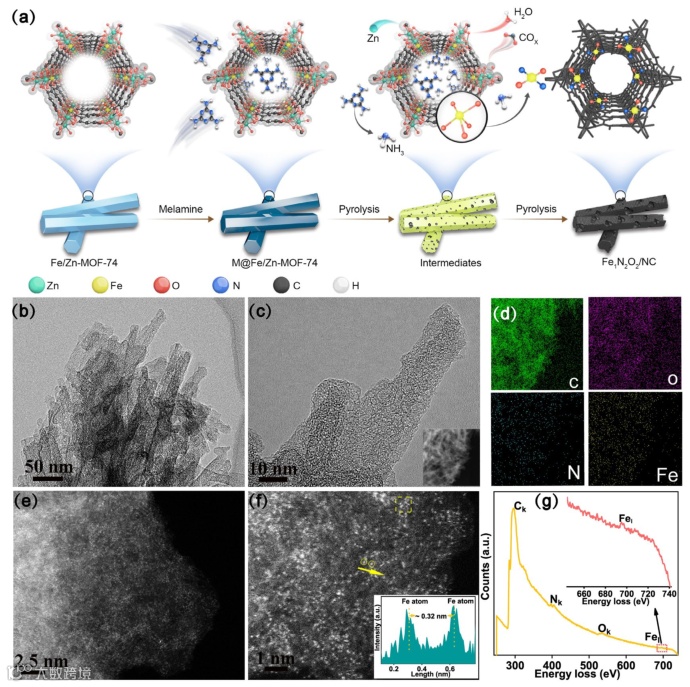 通过TEM、HRTEM 表征结果能够观察到Fe1N2O2/NC良好的棒状形貌。HAADF-STEM得到的EELS点谱进一步有力证明了在Fe1N2O2/NC中,Fe、O、N的共存,表明单个铁被C内部的N和O共同锚定。通过该合成设计,有效解决了以ZIF-8作为前驱物难以得到Fe-O键的难题。