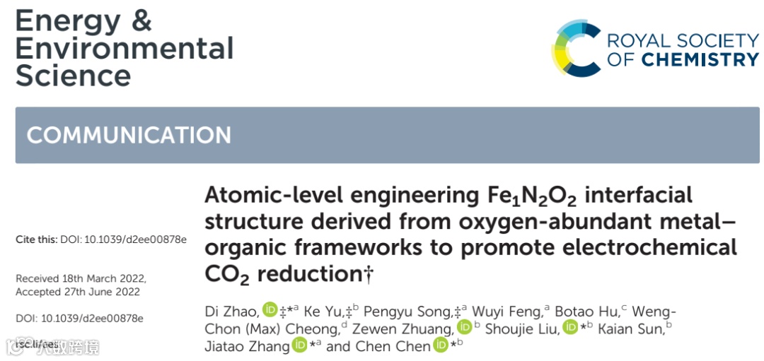 基于此,来自北京理工大学的张加涛教授,赵娣研究员与清华大学的陈晨教授、柳守杰教授等合作,在国际知名期刊Energy& Environmental Science上发表题为“Atomic-Level Engineering Fe1N2O2 Interfacial Structure Derived from Oxygen-Abundant Metal–Organic Frameworks to Promote Electrochemical CO2 Reduction”的研究文章。