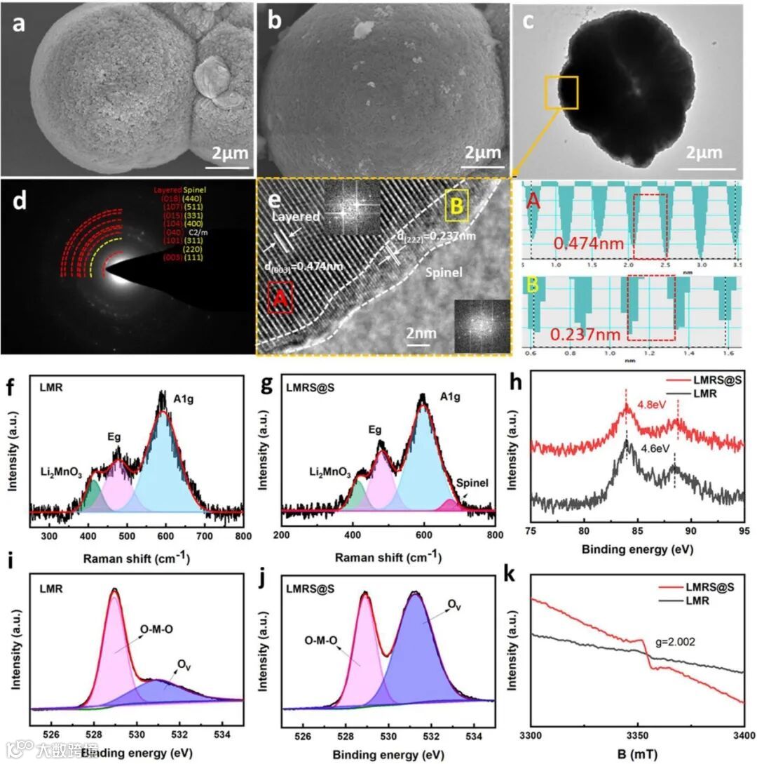 图2 (a) LMR 和 (b) LMRS@S的SEM图片,(c, d) LMRS@S的TEM和对应的SEAD图片, (e) LMRS@S的HRTEM图片,(f, g) 拉曼光谱拟合结果,(h) Mn 3s 和(i, j) O 2p XPS图谱, (k) 室温下电子顺磁共振结果。