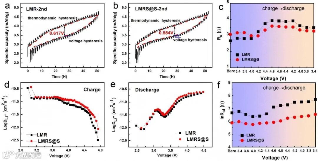 图4. (a, b) 电极的GITT 曲线和(d, e)对应的锂离子扩散系数,(c, f) 电极在不同SOC状态下的 Rs and Rct 变化。