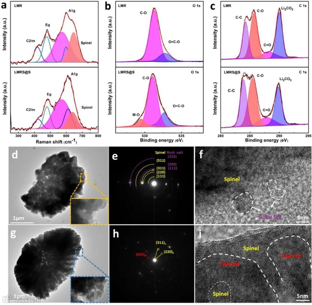 图6. 电极循环200圈后的(a) Raman 图谱S, (b) O 1s 和 (c) C 1s 的XPS图谱,(d-f) LMR电极的TEM图,(g-i) LMRS@S电极的TEM图。