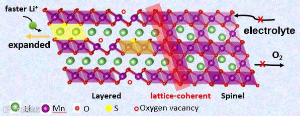 图1. 具有外延尖晶石稳定层的硫化富锂锰基材料结构示意图。