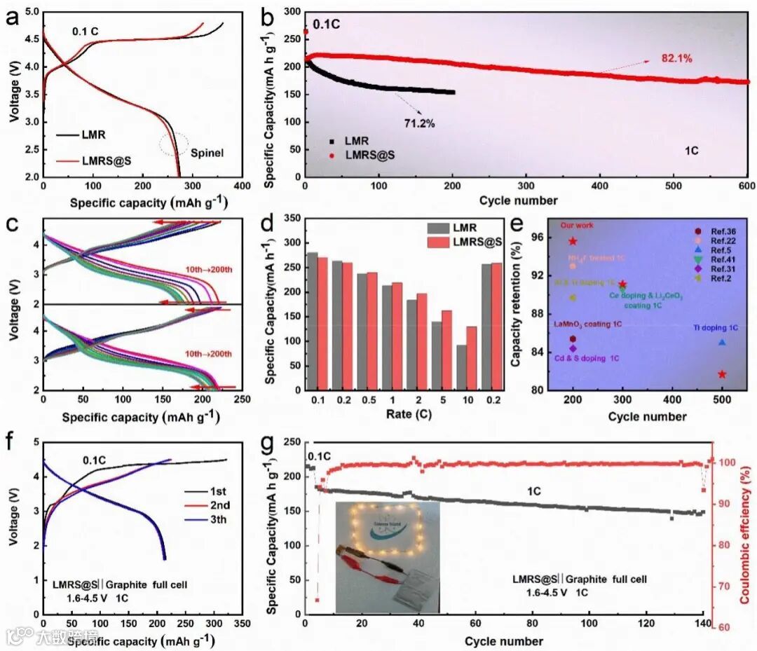 图3 (a) LMR和LMRS@S的首次充放电曲线,(b-d) LMR和LMRS@S的长循环性能和倍率性能图,(e)LMRS@S电极和其它类似材料性能对比图,(f,g) LMRS@S||Graphite软包全电池的前三圈充放电曲线和循环性能图。