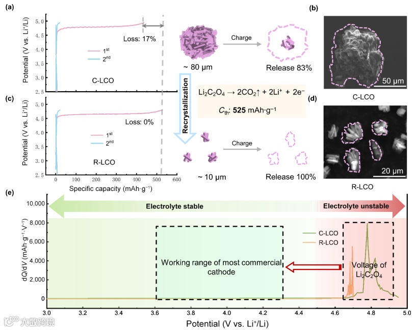 在该工作中,通过重结晶成功地减小草酸锂粒径,重结晶草酸锂(R-LCO)首圈充电容量达529 mA h g-1,容量利用率达100%。因此,通过减小粒径可以提高了草酸锂的容量利用率,但其较高的脱锂电位仍会限制其作为正极预锂化添加剂的应用范围。