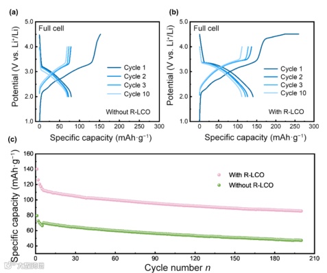 此外,电化学性能证明,Li2C2O4的添加不会影响磷酸铁锂正极结构和性能,Li2C2O4可以将全电池(磷酸铁锂为正极、硬碳为负极)的容量从79.0 mA h g-1增加到140.0 mA h g-1,并且可以显著提高全电池的循环稳定性。
