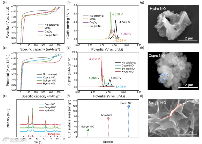 众所周知,催化剂可以降低反应活化能,提高反应活性,Ni、Co、Mn是电池中常用的金属元素,因此本工作采用MnO2、NiO以及MnO2作为催化剂,研究其对R-LCO脱锂电位的影响。研究表明,催化剂的加入均能不同程度降低R-LCO的脱锂电位,并且催化剂的形貌也会影响其催化性能。其中,片状纳米花结构的NiO催化剂具有更好的分散性,能更好地与R-LCO及科琴黑导电剂接触,从而能更有效地降低R-LCO的脱锂电位至4.288 V,使其可与现有商用正极材料相匹配。