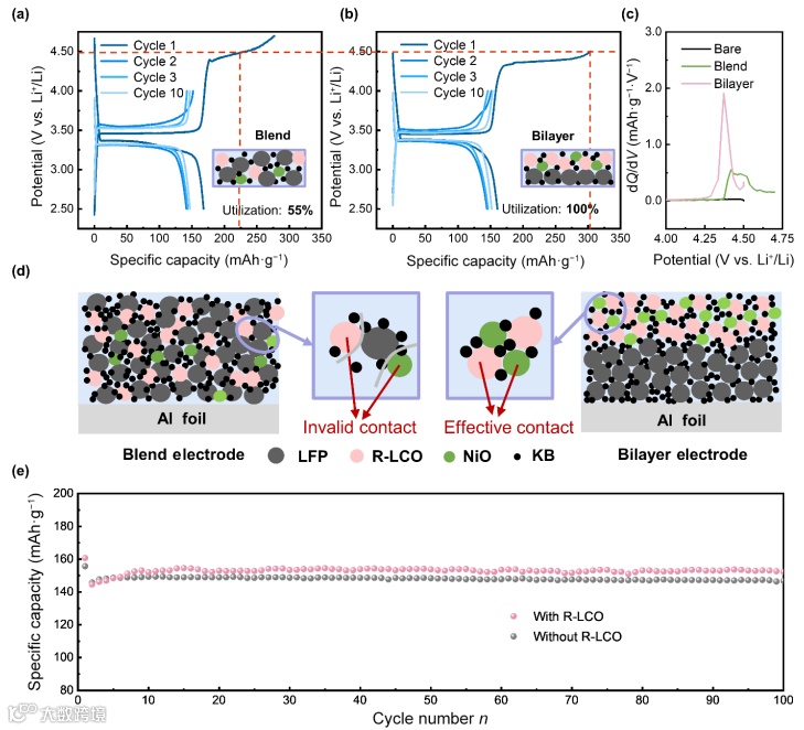 当使用传统的混合电极,即磷酸铁锂、草酸锂、导电剂以及催化剂直接共混时,由于正极材料的大量加入,影响了草酸锂、导电剂和催化剂三者间的接触,降低的催化剂的催化效果,使草酸锂的利用率仅为58%。因此,本项工作提出采用双层电极结构,即一层磷酸铁锂正极层和一层草酸锂补锂层,在这种结构中,草酸锂与催化剂的接触不受正极材料加入的影响,能够保证草酸锂与催化剂间的有效接触,使草酸锂的利用率达到100%。