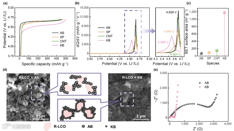 图2. 使用不同导电剂的电化学性能和BET、SEM和EIS表征。