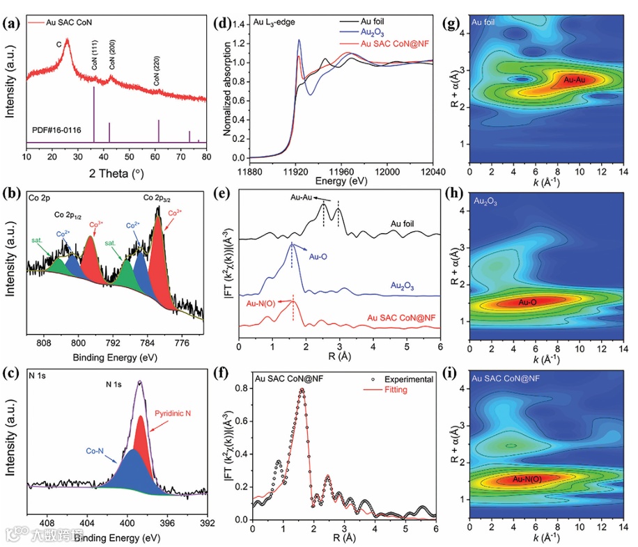 Figure 3. XRD, XPS and XAFS. (a) XRD pattern of Au SAC CoN on carbon cloth. (b, c) High-resolution XPS spectra of (b) Co 2p and (c) N 1s. (d) Au L3-edge normalized X-ray absorption near edge structure spectra. (e) Fourier transforms of the k2-weighted EXAFS spectra at Au L3-edge. (f) The corresponding EXAFS fitting curves at Au R space of Au SAC CoN@NF. (g-i) Wavelet transforms for the k2-weighted EXAFS signals of (g) Au foil, (h) Au2O3, and (i) Au SAC CoN@NF.