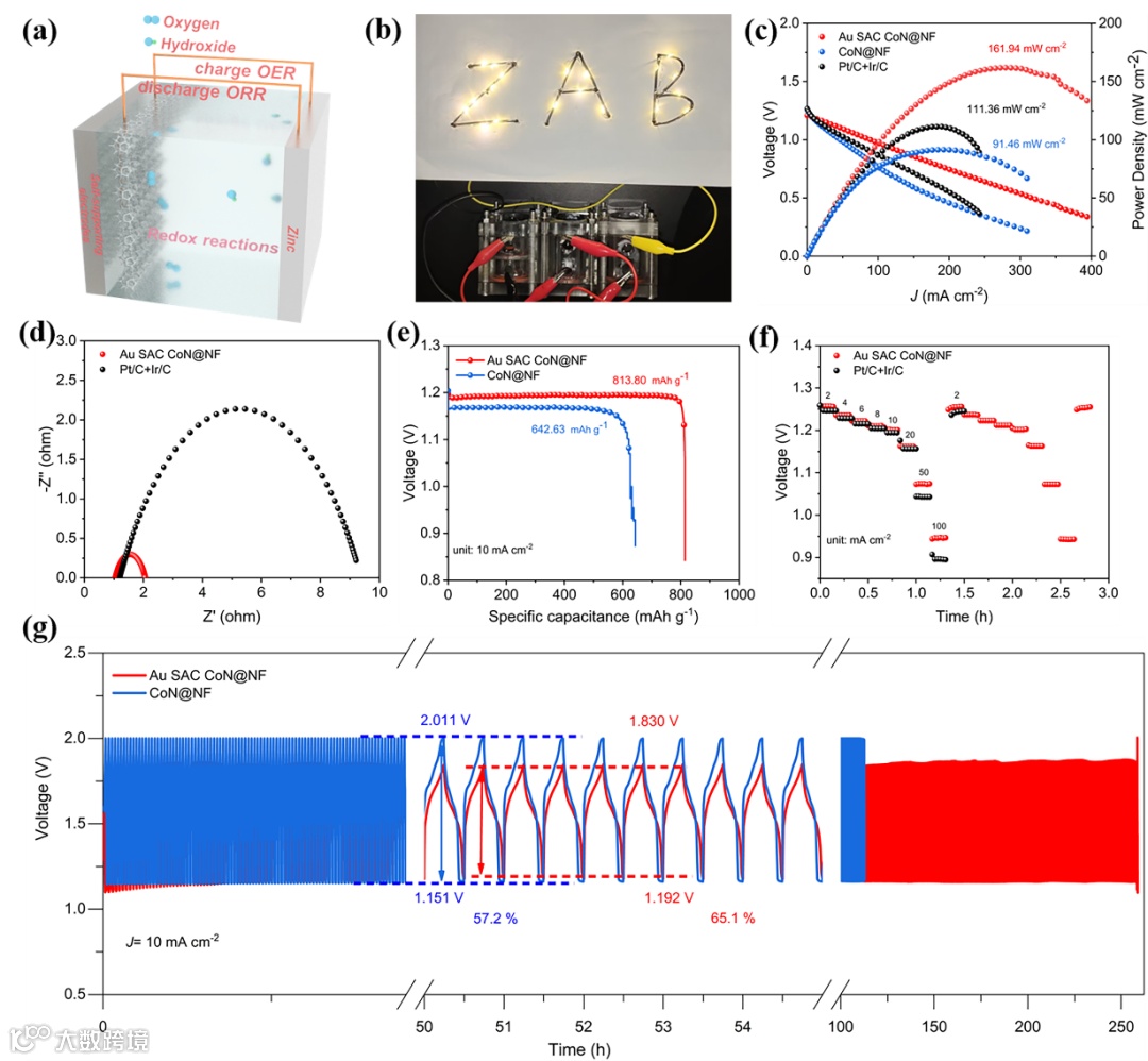 Figure 6. Performance of rechargeable ZAB. (a) Schematic diagram of rechargeable ZABs. (b) A string of orange LED powered by the ZABs based on Au SAC CoN@NF as the cathode catalyst. (c) Discharge polarization curves and corresponding power density curves for the air electrode with Au SAC CoN@NF, CoN@NF, and Pt/C + Ir/C cathode catalysts. (d) Nyquist plots of Au SAC CoN@NF and Ir/C. (e) Comparison of specific capacities of the ZABs at 10 mA cm−2. (f) Test open-circuit voltage and rate discharge curves of the assembled ZABs with Au SAC CoN@NF and Pt/C + Ir/C catalysts at various current densities. (g) Long-term discharge/charge cycling performance of the ZABs at a current density of 10 mA cm−2.