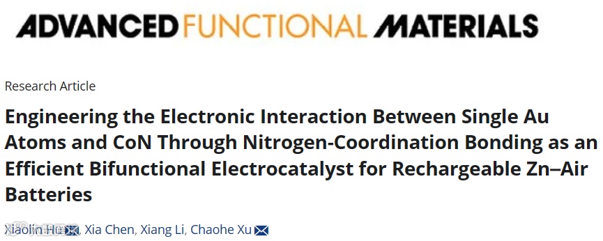 近日,来自重庆理工大学的胡小林副教授与重庆大学的徐朝和教授团队合作,在国际知名期刊Advanced Functional Materials期刊发表题为“Engineering the Electronic Interaction Between Single Au Atoms and CoN Through Nitrogen‐Coordination Bonding as an Efficient Bifunctional Electrocatalyst for Rechargeable Zn–Air Batteries”的研究论文。该研究文章利用电子金属-载体相互作用(EMSI)策略设计Au单原子铆钉在以半导体特性著称的氮化钴(CoN)上,所获得的Au SAC CoN@NF催化剂表现出优异的储能催化电化学性能。