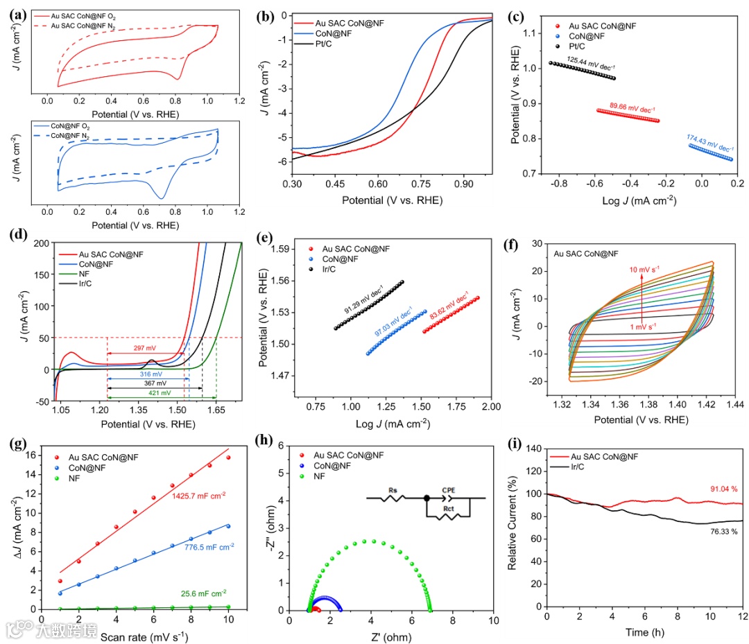 Figure 4. Electrochemical characterization. (a) CV curves. (b) ORR LSV curves, and (c) Tafel plots of Au SAC CoN@NF, CoN@NF, and Pt/C. (d) OER LSV curves and (e) Tafel plots of Au SAC CoN@NF, CoN@NF, and Ir/C. (f) Typical CV profiles of the Au SAC CoN@NF used for the non-Faradic capacitance estimations. (g) Cdl plots of Au SAC CoN@NF, CoN@NF, and NF. (h) Nyquist plots of Au SAC CoN@NF, CoN@NF, and NF (the inset displays the electrical equivalent circuit). (i) Durability of Ir/C and Au SAC CoN@NF at a constant overpotential for OER.