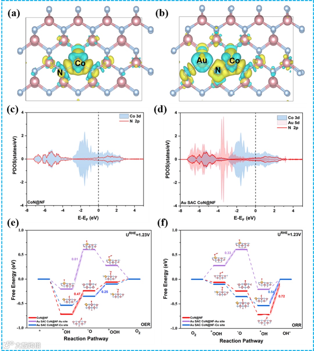 Figure 5. DFT calculations. Charge density differences (in top view) for (a) CoN@NF (220) and (b) Au SAC CoN (220). The iso-surface value is 0.003 e/Å3, with cyan and yellow representing electron depletion and accumulation, respectively. Partial density of states of (c) CoN@NF (220) and (d) Au SAC CoN (220). The Fermi level is set to zero in dotted line. (e) OER and (f) ORR free energy diagram of different sites at the equilibrium potential URHE=1.23 V.