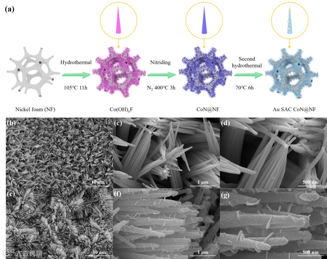 Figure 1. Synthetic process and material characterizations. (a) Schematics of the synthesis process of the Au SAC CoN@NF. SEM images of (b-d) CoN@NF and (e-g) SEM images of Au SAC CoN@NF at different resolutions.