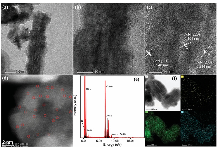 Figure 2. Material characterizations of Au SAC CoN@NF. (a-b) TEM images. (c) HR-TEM image. (d) AC-STEM image and (e) the corresponding EDS composition. (f) STEM‐EDX elemental mapping.